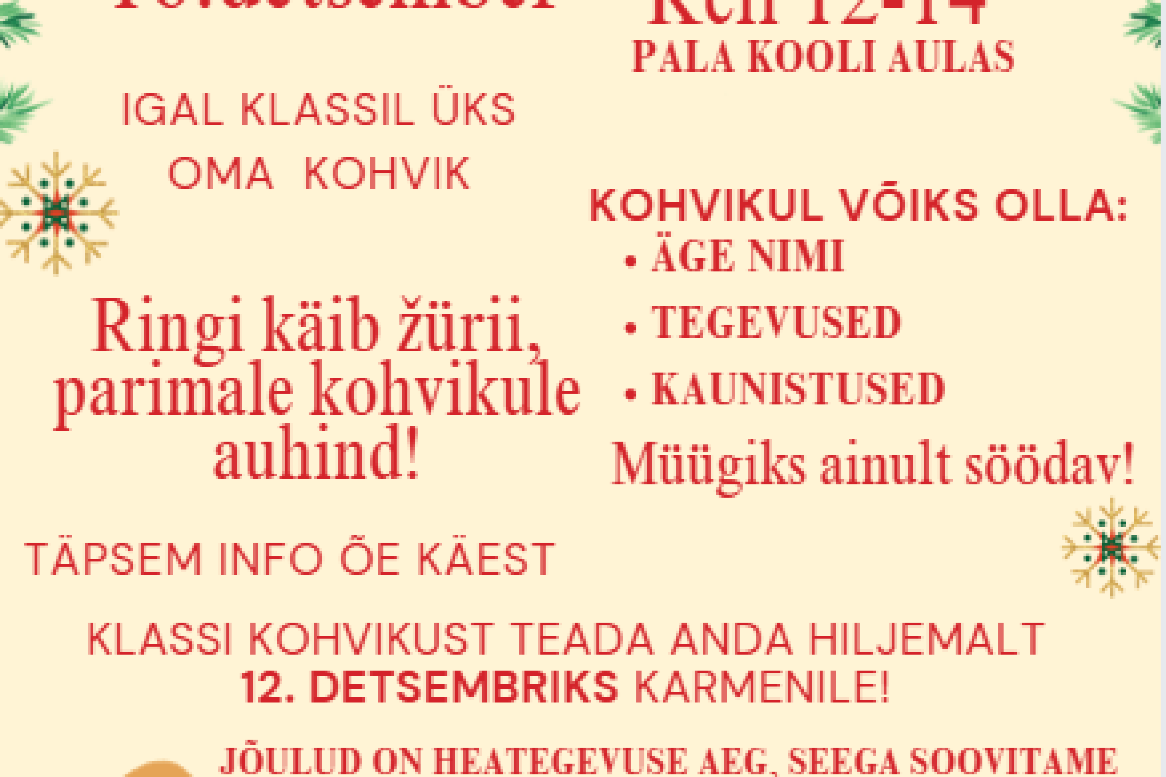 Oluline Jõulupidu Loomise kuupäev 03.11.2025 Autor Reelika Berg Jõulukampsunipäev Loomise kuupäev 08.12.2025 Autor Reelika Berg Advendihommik Loomise kuupäev 24.11.2025 Autor Reelika Berg Kadripäev Loomise kuupäev 17.11.2025 Autor Reelika Berg Vaata rohkem