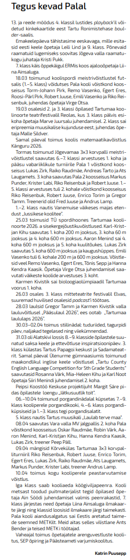 Meie lood Märtsi tegemised Loomise kuupäev 26.03.2026 Autor Reelika Berg Meie lood Veebruari tegemised 2025/2026 Loomise kuupäev 02.03.2026 Autor Reelika Berg Meie lood Jaanuari tegemised 2026.a Loomise kuupäev 02.02.2026 Autor Reelika Berg Meie lood Novembri tegemised Loomise kuupäev 18.12.2025 Autor Reelika Berg Vaata rohkem