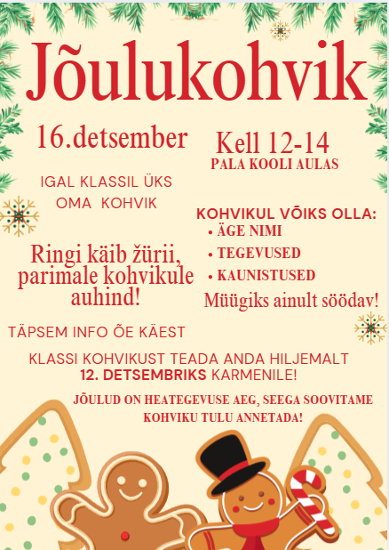 Oluline Jõulupidu Loomise kuupäev 03.11.2025 Autor Reelika Berg Jõulukampsunipäev Loomise kuupäev 08.12.2025 Autor Reelika Berg Advendihommik Loomise kuupäev 24.11.2025 Autor Reelika Berg Kadripäev Loomise kuupäev 17.11.2025 Autor Reelika Berg Vaata rohkem